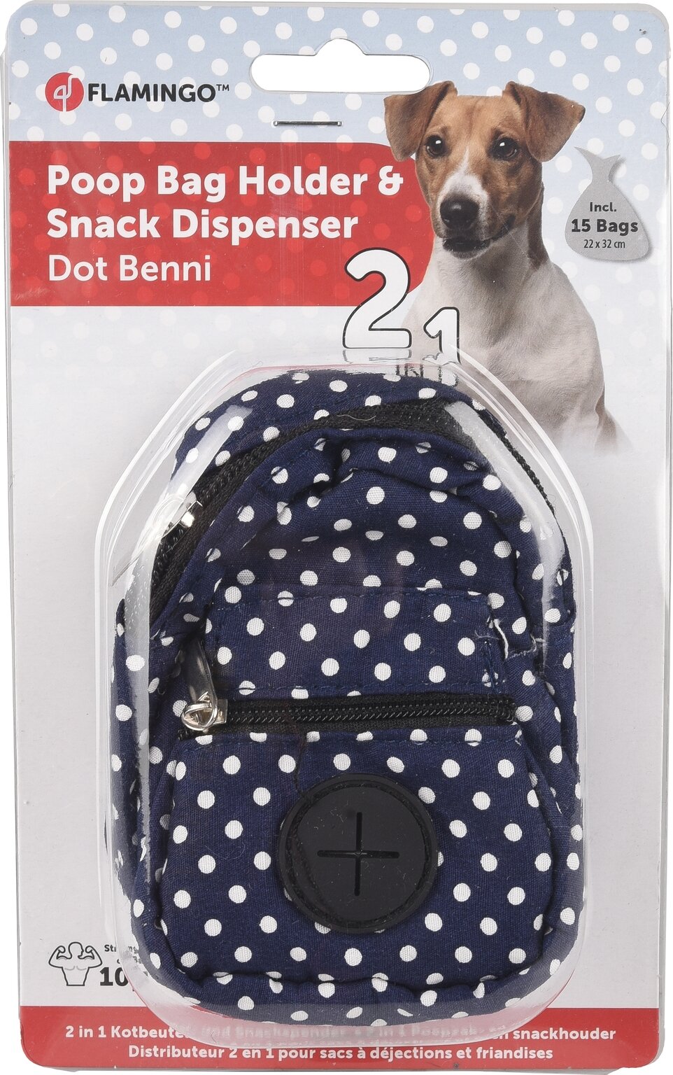 Met deze houder zijn de poepzakjes steeds binnen handbereik en kan de omgeving eenvoudig schoongehouden worden. Met karabijnhaak en elastische bandjes. Groot opbergvak met rits. Inclusief 1 rol van 15 zakjes.