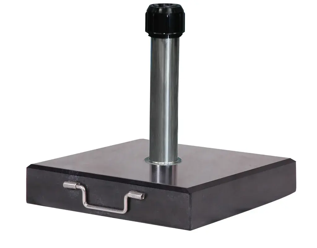 Voorzien van zwenkwielen waardoor de parasolvoet makkelijk te verplaatsen is. Uitgevoerd met roestvrij stalen buizen, anti-slip systeem en waterafvoer. Door het unieke adapter systeem staan parasols met een buisdiameter tot en met 48mm altijd in het midden en verticaal rechtop. Het anti-slip systeem zorgt dat de parasol niet kan tollen in de wind.Deze natuurstenen parasolvoet is vervaardigd van speciaal geselecteerd graniet en zwart gepolijst.