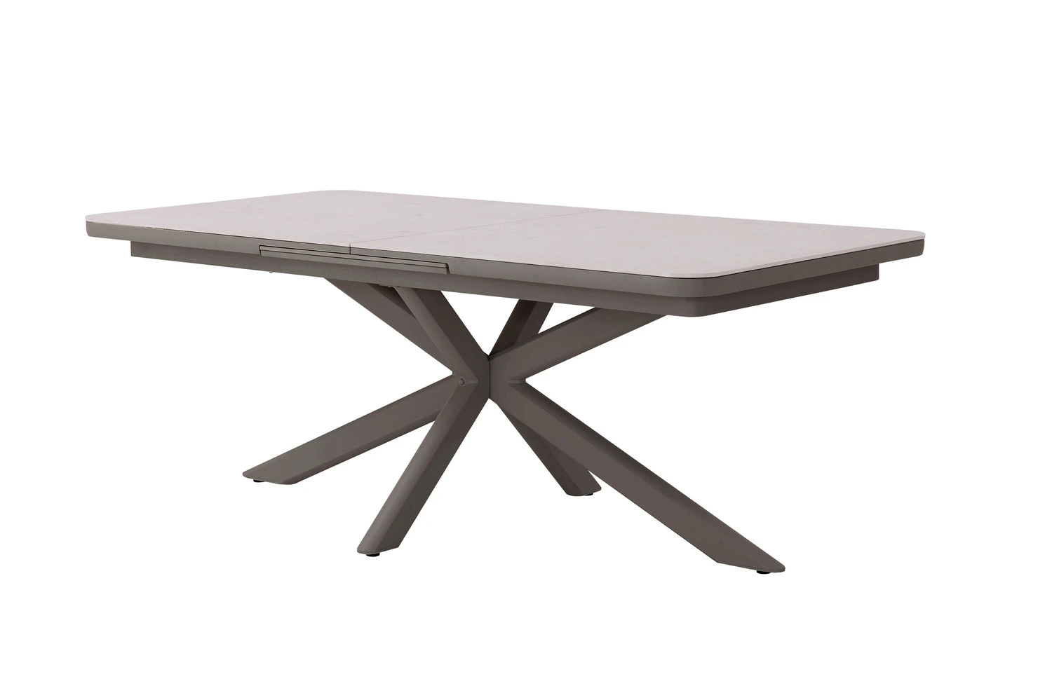 De Jura dining tafel vormt het centrale middelpunt van de set en is opgebouwd uit een espresso aluminium frame met een naturel sintered stone tafelblad. Dit zorgt voor een stabiele en duurzame basis. Met afmetingen van L 204/264 x B 100 x H 75 cm is er voldoende ruimte om comfortabel te dineren.