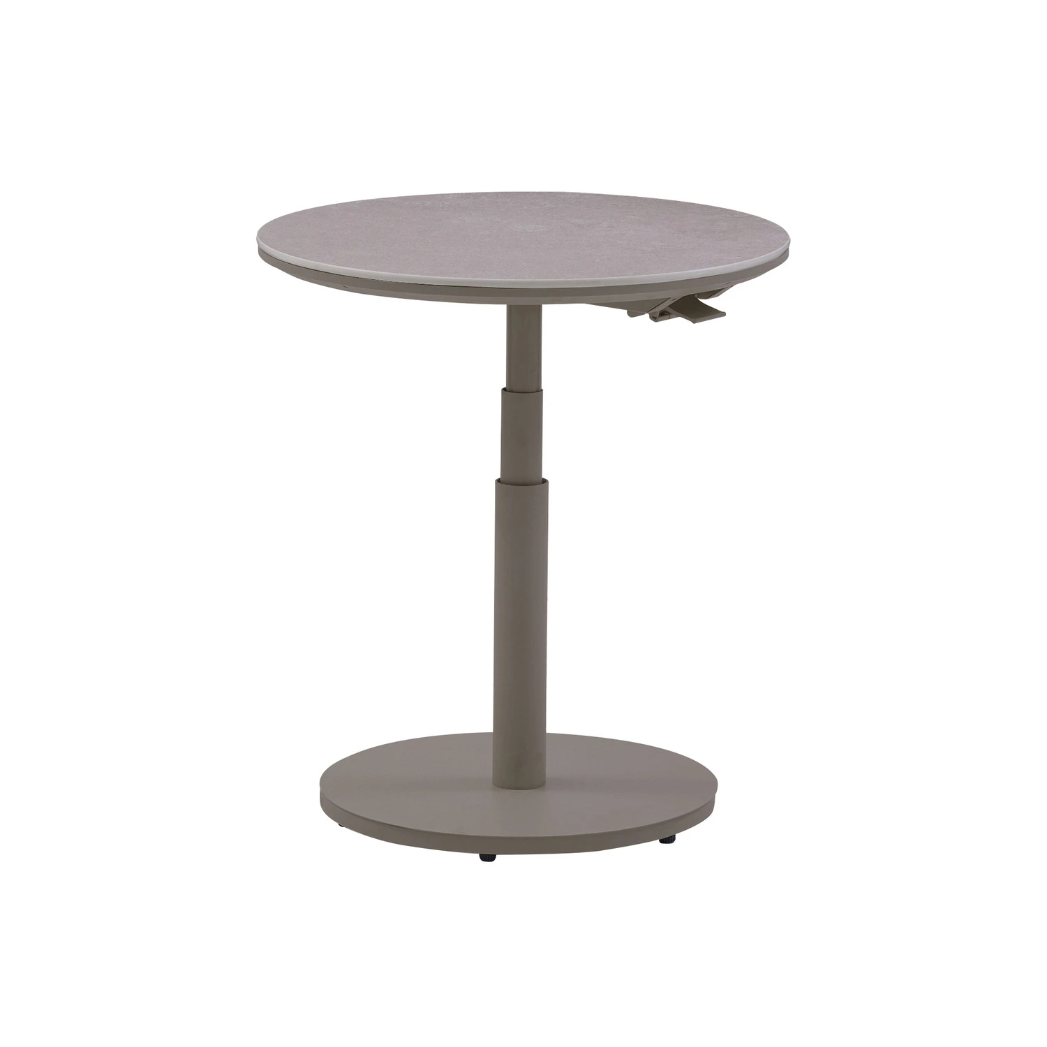 Met een diameter van 60 cm en een verstelbare hoogte van 45/66 cm kun je de tafel eenvoudig aanpassen aan jouw behoeften. Het aluminium frame is lichtgewicht en stevig, terwijl het sintered stone blad onderhoudsvriendelijk, kras- en hittebestendig is. Het ronde ontwerp en het tijdloze kleurgebruik maken de tafel een veelzijdige en elegante toevoeging voor ieder terras, balkon of tuin.