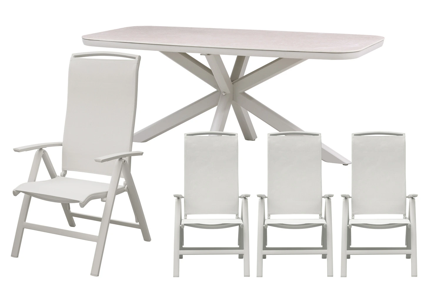 Binnen deze opstelling is de Jura dining tafel het centrale punt voor diners en gezellige buitenmomenten. Met een zandkleurig aluminium frame en een sintered stone tafelblad in naturel krijgt dit onderdeel een uitstraling die goed past bij intensief gebruik in tuin of op terras. Daarnaast heeft het meubel afmetingen van L 180 x B 90 x H 74 cm.
