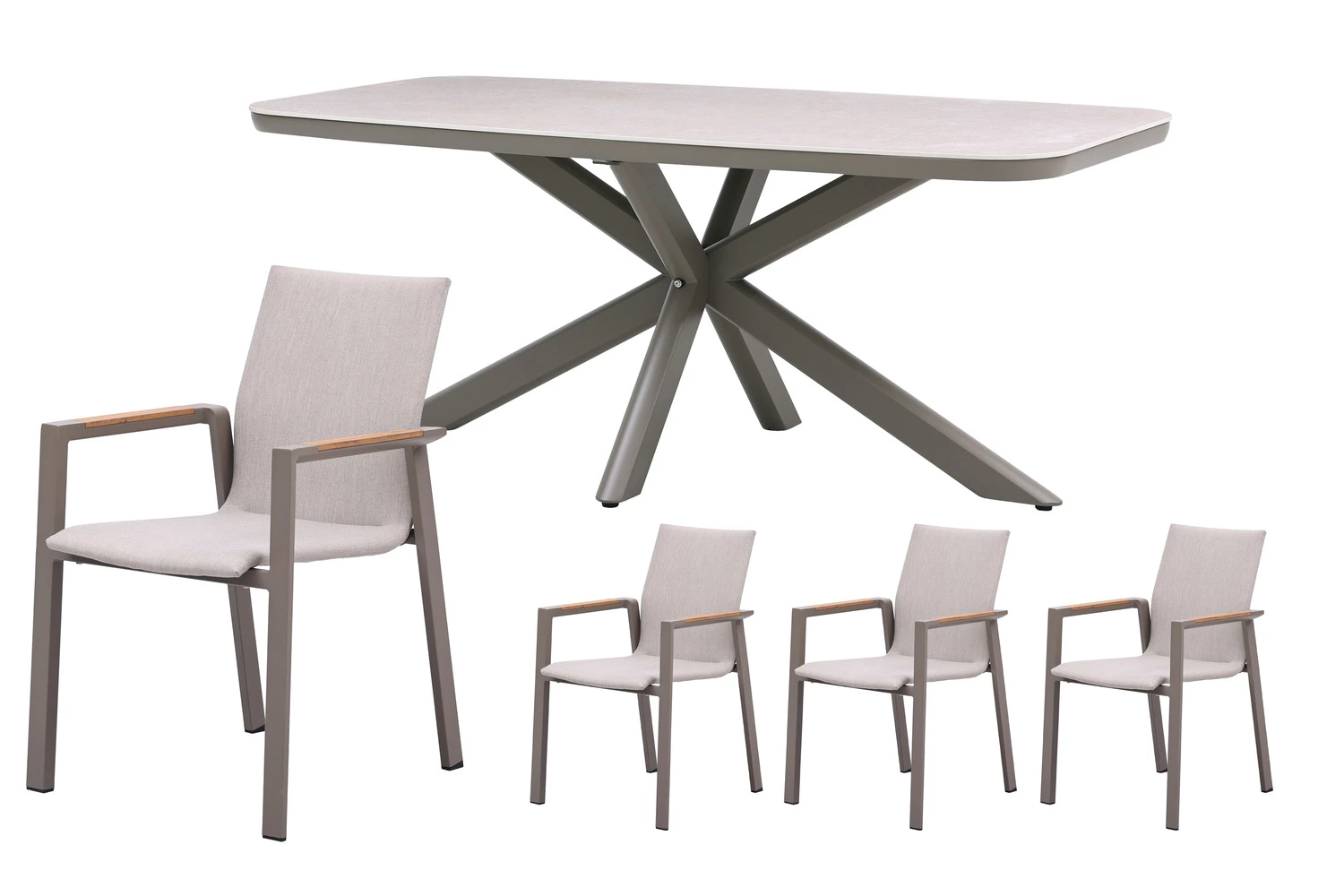 De Jura dining tafel vormt het centrale middelpunt van de set en is opgebouwd uit een espresso aluminium frame met een naturel sintered stone tafelblad. Dit zorgt voor een stabiele en duurzame basis. Met afmetingen van L 180 x B 90 x H 74 cm is er voldoende ruimte om comfortabel te dineren.