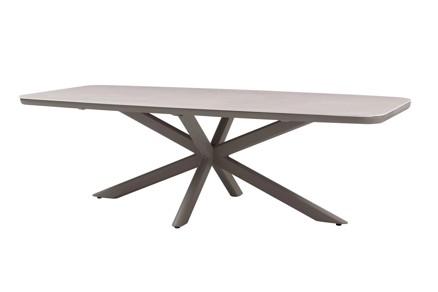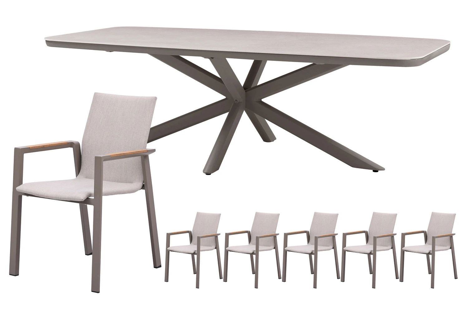 De Jura dining tafel vormt het centrale middelpunt van de set en is opgebouwd uit een espresso aluminium frame met een naturel sintered stone tafelblad. Dit zorgt voor een stabiele en duurzame basis. Met afmetingen van L 240 x B 110 x H 74 cm is er voldoende ruimte om comfortabel te dineren.