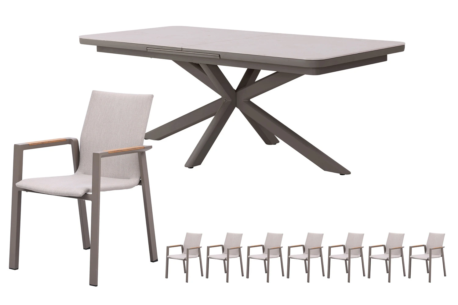 De Jura dining tafel vormt het centrale middelpunt van de set en is opgebouwd uit een espresso aluminium frame met een naturel sintered stone tafelblad. Dit zorgt voor een stabiele en duurzame basis. Met afmetingen van L 204/264 x B 100 x H 75 cm is er voldoende ruimte om comfortabel te dineren.