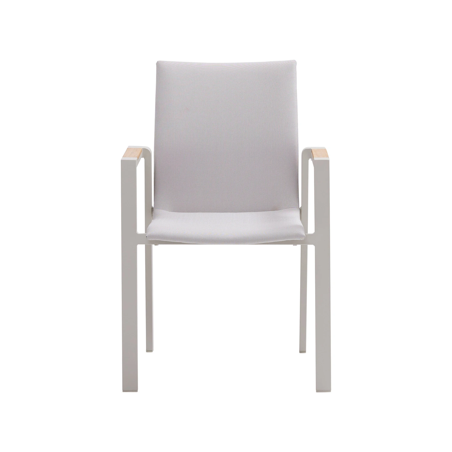 Binnen deze set zorgt de Solare dining stoelen voor comfortabel zitgemak aan tafel. De gebruikte materialen, waaronder een zandkleurig aluminium frame en beige textileen bekleding, zorgen voor een verzorgde look en maken het meubel prettig in dagelijks gebruik. Ook praktisch is een stapelbaar ontwerp en afmetingen van B 57 x D 63 x H 87 cm.