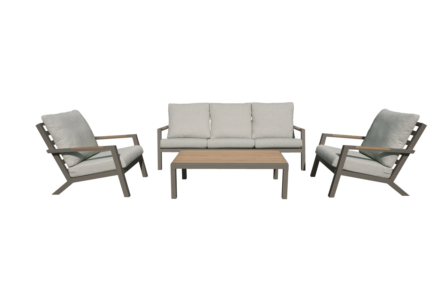 De Bahia salontafel vormt het centrale middelpunt van de set en is opgebouwd uit een espresso aluminium frame met een naturel teakhout tafelblad. Dit zorgt voor een stabiele en duurzame basis. Met afmetingen van L 120 x B 70 x H 38 cm is er voldoende ruimte om comfortabel te dineren.