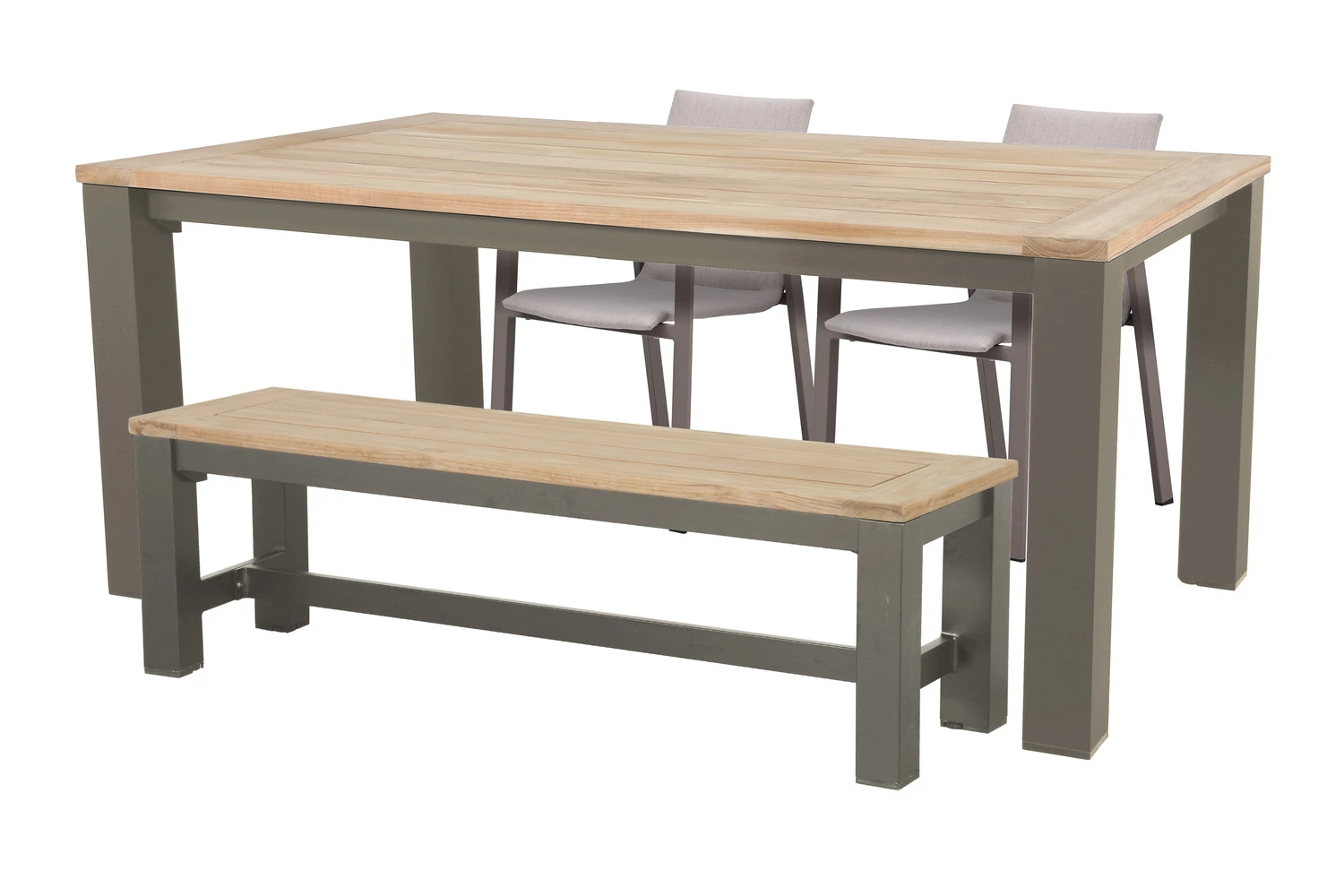 De Atlanta dining tafel vormt het centrale middelpunt van de set en is opgebouwd uit een espresso aluminium frame met een naturel teakhout tafelblad. Dit zorgt voor een stabiele en duurzame basis. Met afmetingen van L 160 x B 90 x H 76 cm is er voldoende ruimte om comfortabel te dineren.