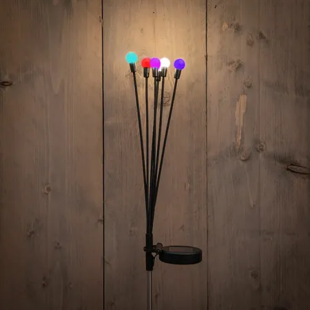 Geef je tuin extra sfeer met deze solar tuinsteker met zes vuurvliegjeslampjes. De LED-lampjes veranderen van kleur en bewegen zachtjes mee met de wind, wat zorgt voor een levendig en speels effect. Overdag laadt de lamp op via zonne-energie, zodat hij ‘s avonds automatisch gaat branden. Met een hoogte van 69 cm en een breedte van 7 cm is deze decoratieve tuinsteker ideaal voor borders, bloempotten of langs tuinpaden. Eenvoudig in de grond te steken en perfect voor extra verlichting zonder stroomgebruik.