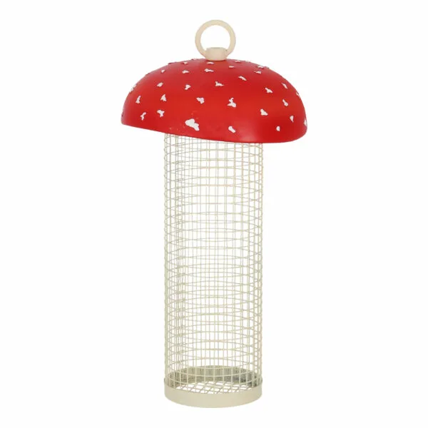 Vul deze vliegenzwamnotensilo met pinda’s of noten. Door de open structuur kunnen de vogels de voederbank van alle kanten benaderen. De vliegenzwamnotensilo is eenvoudig (bij) te vullen door de ring los te draaien en het deksel op te tillen.