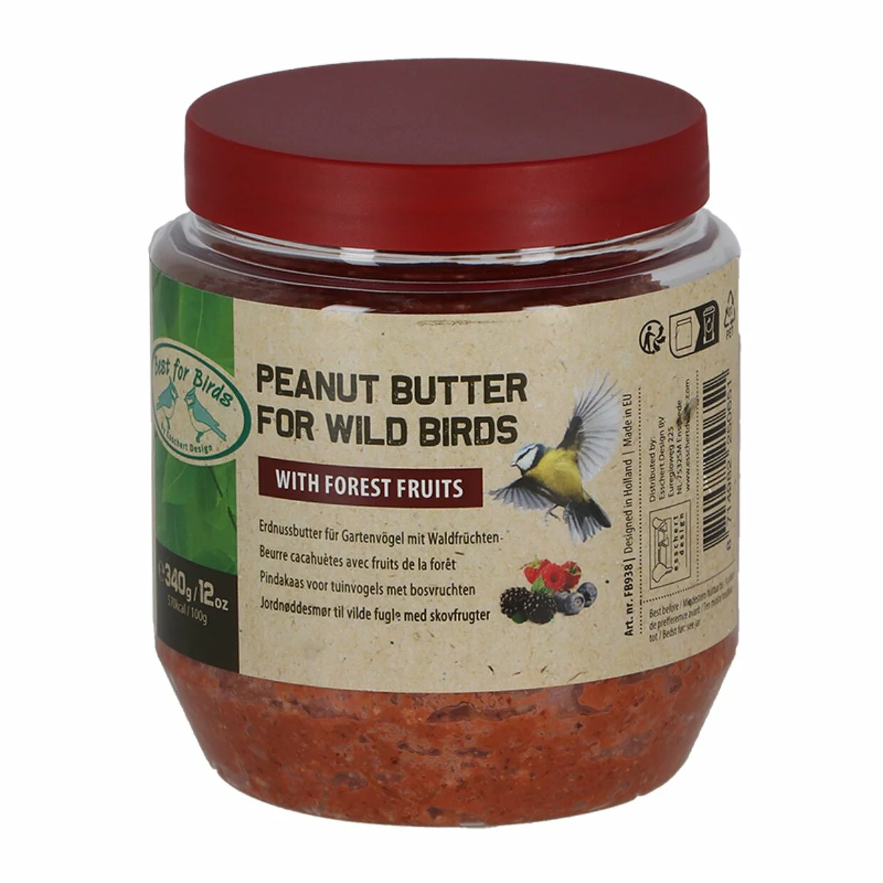 De Esschert Design Vogelpindakaas met bosvruchten is een voedzame traktatie voor tuinvogels, geschikt voor elk seizoen. In de lente helpt het vogels tijdens hun drukke voortplantingsperiode, in de zomer ondersteunt het bij de rui, in de herfst bij de voorbereiding op de winter, en in de winter voorziet het in extra energie om warm te blijven. Deze pindakaas kan het hele jaar door veilig worden gevoerd.