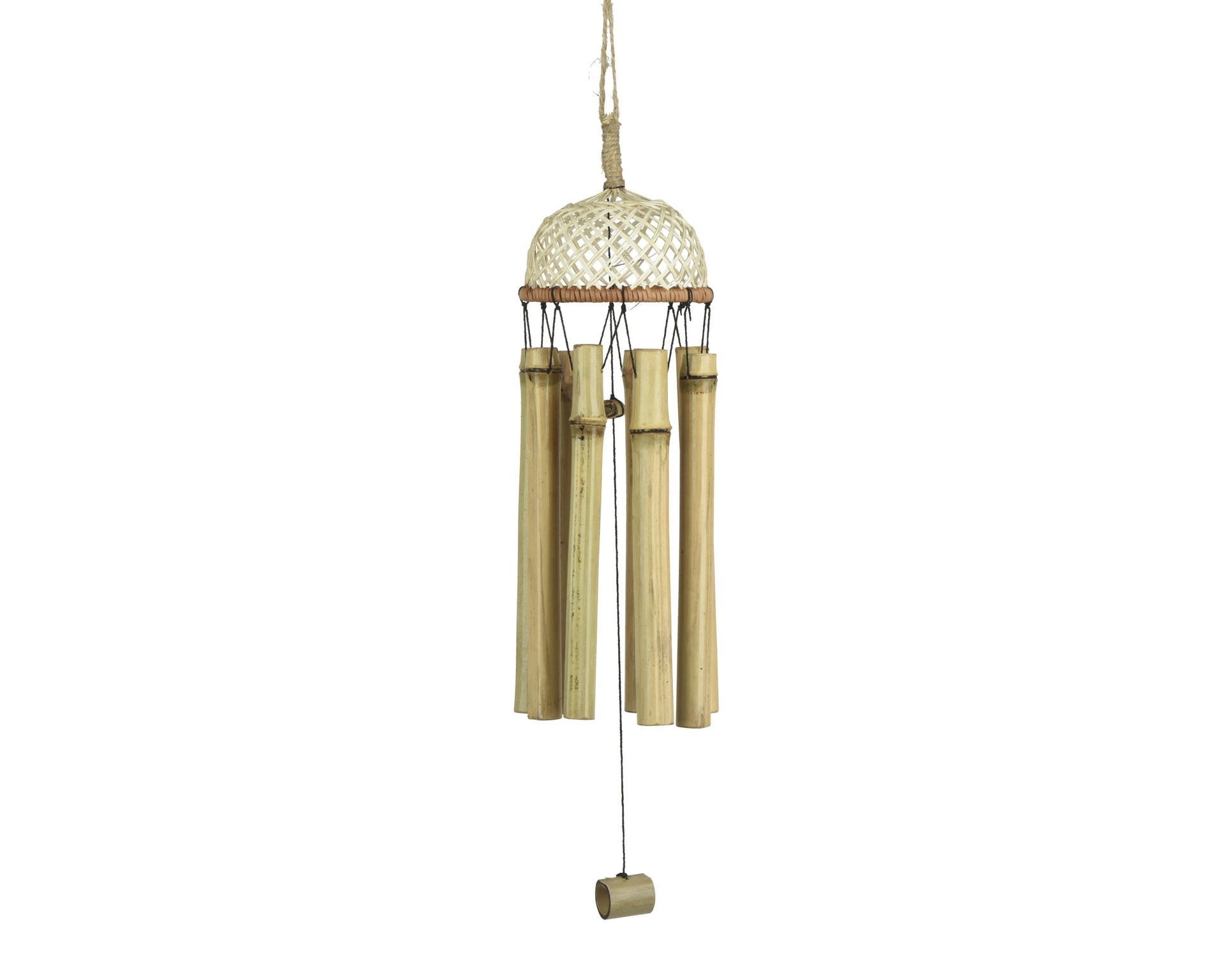 De zachte tonen van deze windgong creëren een serene sfeer, perfect voor ontspannen momenten in de tuin of op het balkon. Deze ronde windgong bestaat uit zeven lange bamboebuizen, bevestigd met duurzame, natuurlijke jutekoorden aan een gevlochten kap. Met een hoogte van 65 cm en een diameter van 11 cm biedt dit decoratief buitenitem een warme, rustieke uitstraling en past uitstekend binnen een natuurlijke, organische stijl.